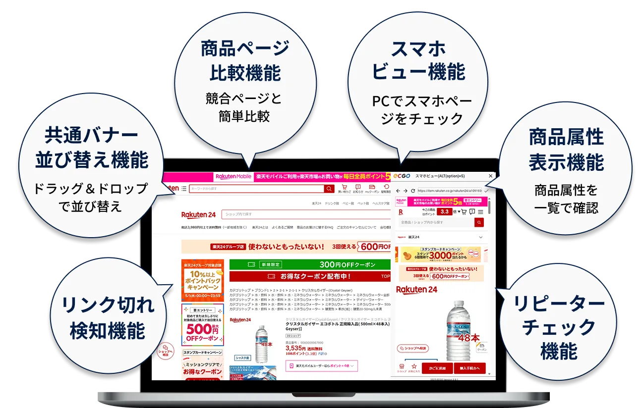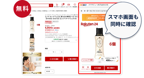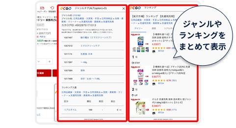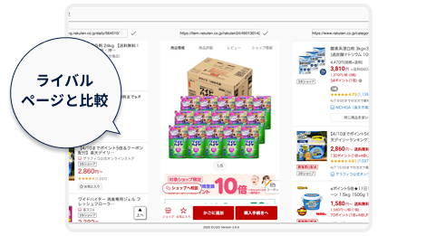 閲覧中の商品ページを中央に表示しつつ、左にジャンル別ランキング、右に同ジャンルの商品一覧を表示。ランキング上位やレビューの多いライバル商品と並べて比較でき、商品画像や説明文の改善点がひと目で分かります。