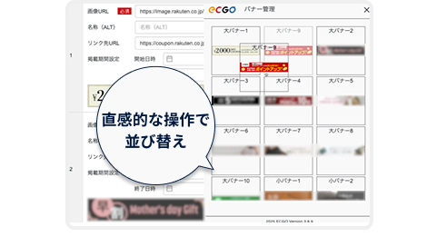 「商品画像並び替え」と「バナー管理」では、RMS 内でバナーをドラック&ドロップすることで、順番を入れ替えることができます。