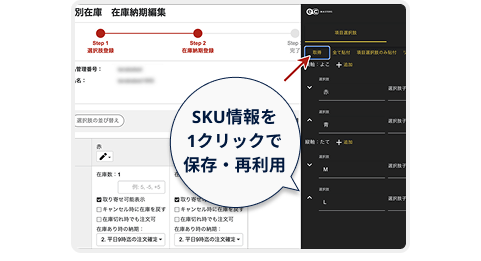 選択肢ごとの在庫数やSKUコードを一覧で確認・編集できます。過去に設定した在庫内容を保存・再利用できるほか、複数商品の在庫情報を一括で管理・調整できるので、在庫調整もスピーディーに行えます。
