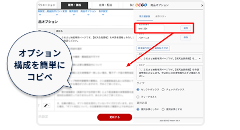 「商品オプション」では、閲覧している商品ページの商品オプションをリストとして保存でき、更に商品管理番号を指定して、ワンクリックで別の商品ページの商品オプションの新規や追加で貼り付けることができます。