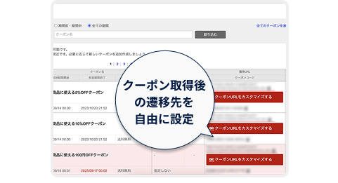 クーポン取得後の「リダイレクト先」を変更することで、ユーザーを「売りたい/買ってほしい商品」へ直接誘導できます。 これにより、クーポン使用率や転換率の向上を狙います。