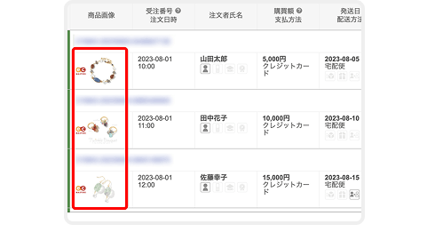 受注管理画面に、注文された商品の第一画像を表示させることができ、どの商品が注文されたかが一目で分かります。