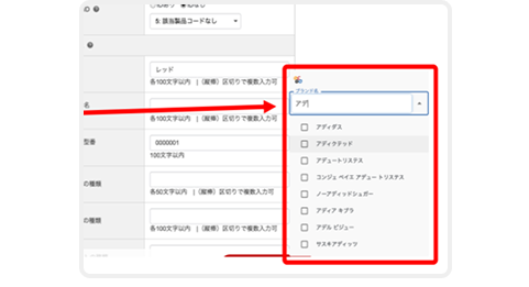「属性入力補助」は、ブランド名など商品属性を入力する際、最大10個までしか表示されない属性をすべて一覧で表示することができ、キーワードで検索できるようになります。
