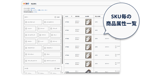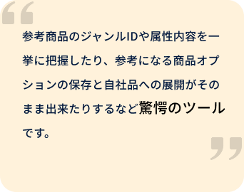色やサイズなど、バリエーションが増えるほど煩雑になるSKU管理。 「商品属性」では、自店・他店の商品ページに登録されている属性項目を一覧で確認できます。 製品情報・商品仕様をライバルや上位ショップがどこまで細かく対策しているかも一目瞭然。