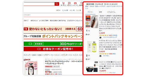 閲覧している商品の、デイリー、週間、リアルタイムのランキング一覧を確認することができます。