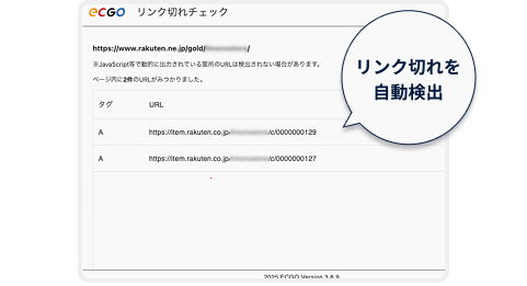 「リンク切れチェック」では、商品ページはもちろん、楽天GOLDなどさまざまなページのリンク切れを検出します。 リンク切れはユーザー離脱や回遊率の低下、売上機会の損失にもつながるため、速やかに対処することをおすすめします。