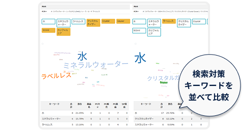検索結果から商品を2つ選び、商品名・キャッチコピー・商品画像・商品説明文など徹底的に比較できるツールです。ライバルページと自社ページの違いが一目瞭然。検索対策の差を隅々まで把握できます。