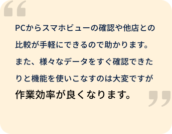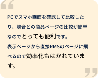 楽天市場では、お客様の約9割がスマホから閲覧。実機がなくてもPCでスマホ表示をチェックでき、手軽にスマホ対策が始められます。Yahoo!ショッピング、Amazon、au PAYマーケットにも対応しています。