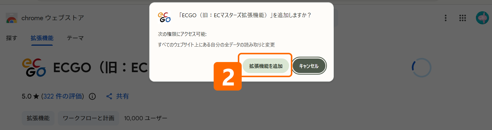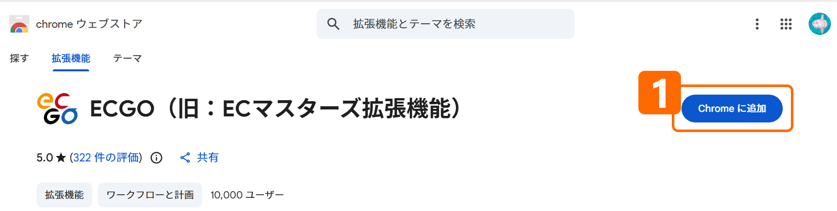 - ECGOのインストールページにアクセスし、Chromeに追加(青いボタン)をクリックします。