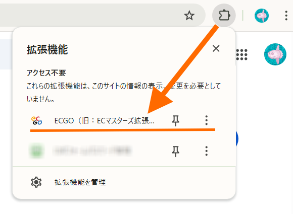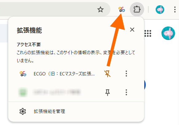 画面右上の拡張機能ボタン(パズルピースマーク)をクリックして、ECマスターズ拡張機能が表示されていたら、インストールが完了しています。