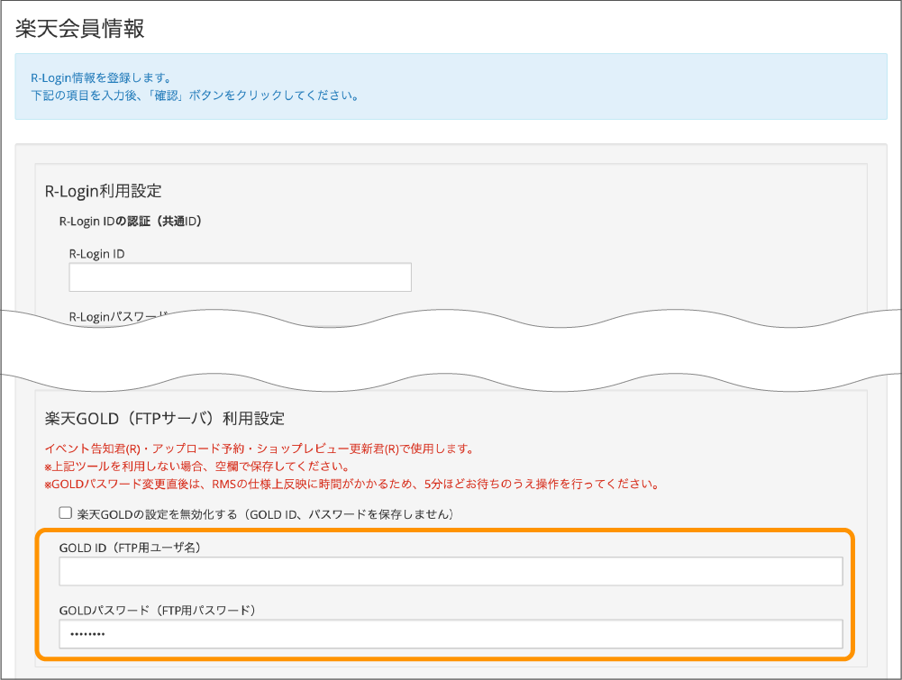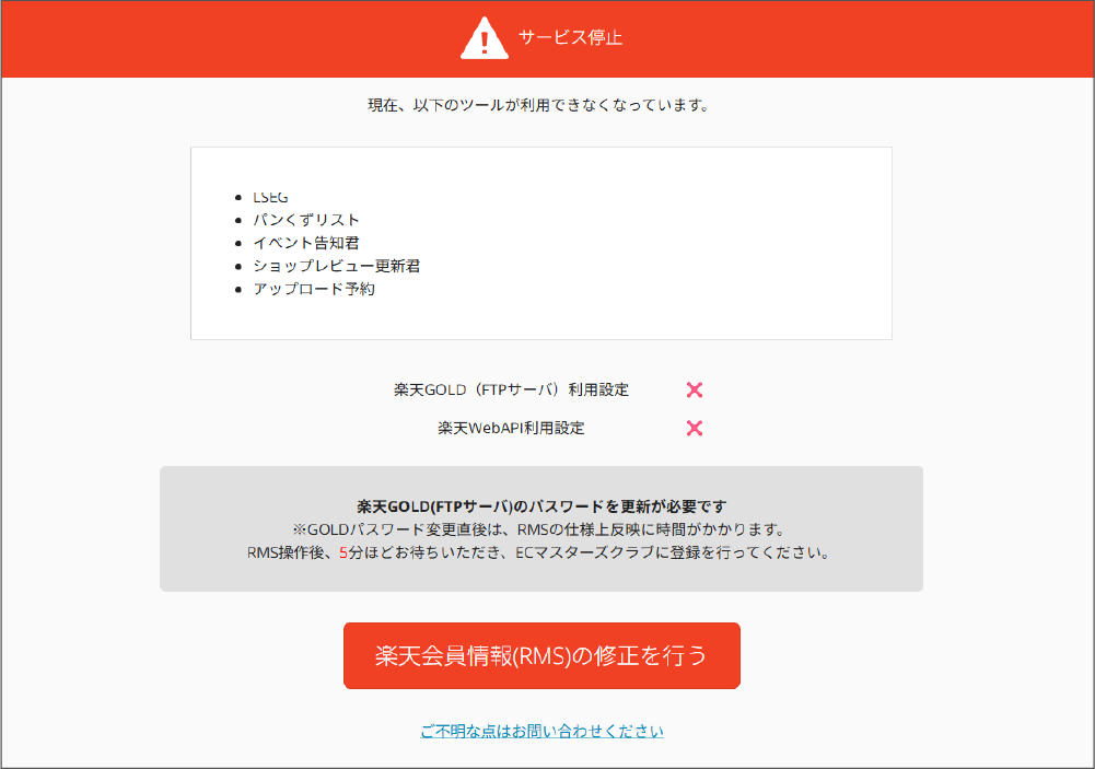 ECマスターズクラブにアクセスした際、左記の表示が出た場合は、楽天GOLDのFTPパスワードの有効期限が切れています。