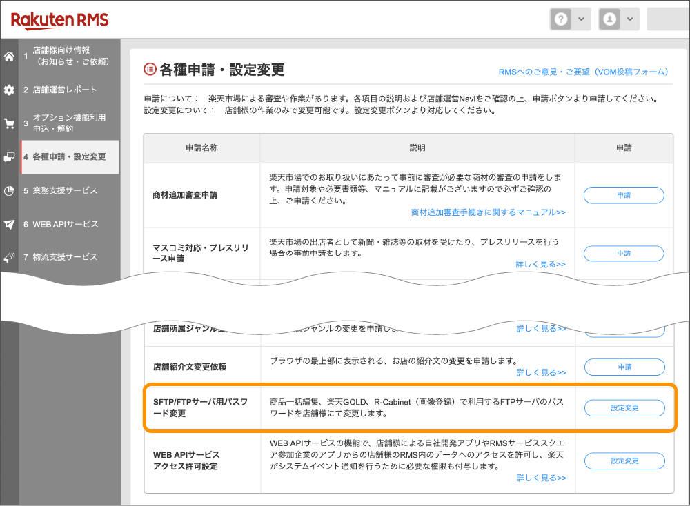2 「SFTP/TFPサーバ用パスワード変更」の「設定変更」をクリック