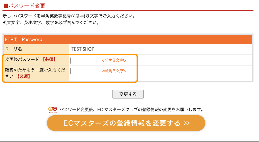 3 新しいパスワードを入力して、「設定変更」をクリックし、更新完了です。