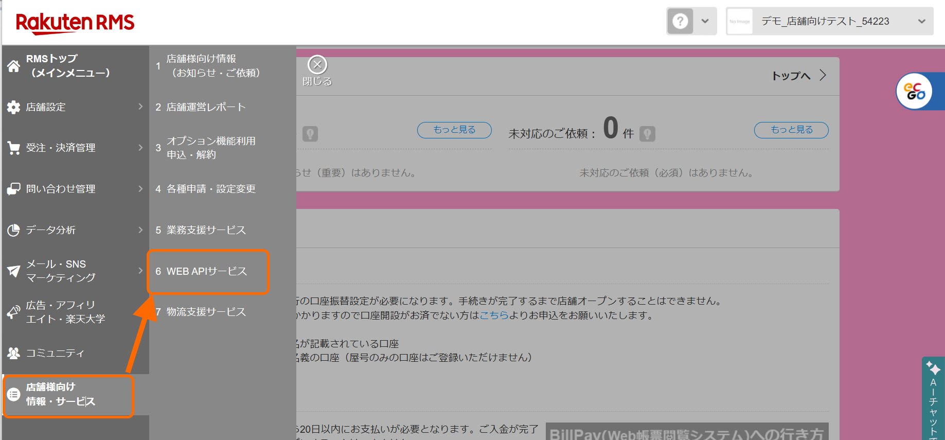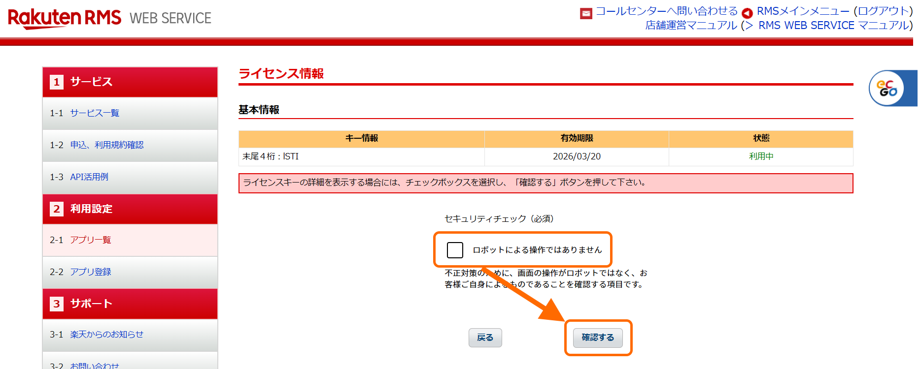 「Rakuten RMS WEB SERVICE」の画面が開きます。
