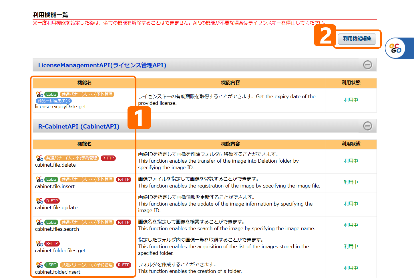 利用機能編集画面が開きます。