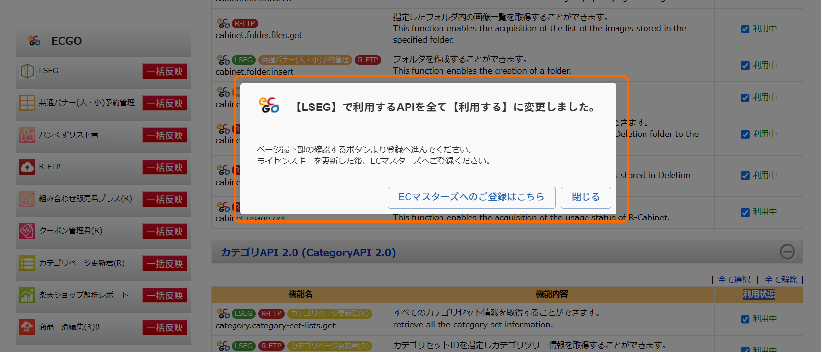 ご利用するECマスターズツール名の「一括反映」ボタンをクリックすると、