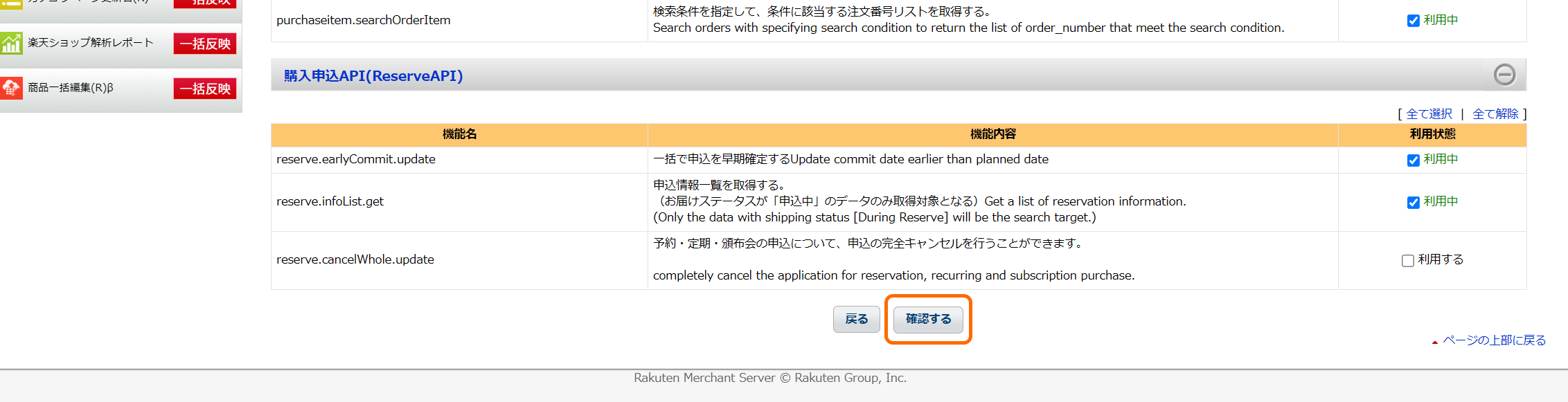必要なAPIの「利用中」にチェックが入りましたら、一番下までスクロールし「確認する」ボタンをクリックします。